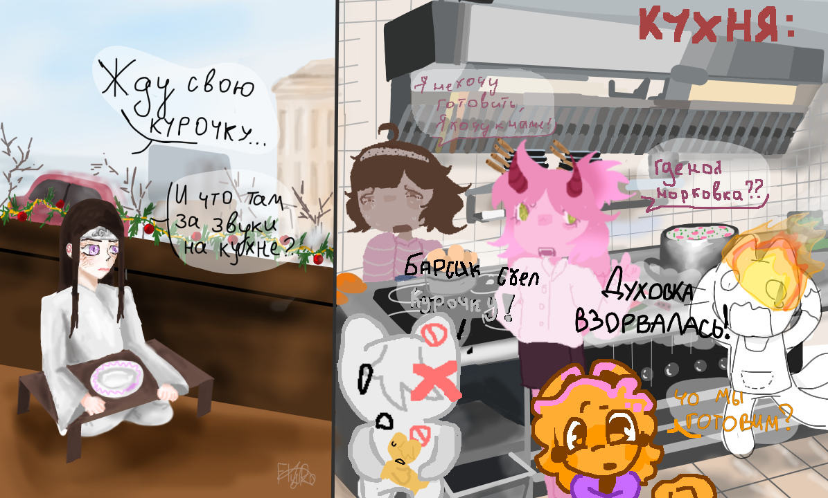 Пословица "У семи нянек дитя без глазу" отлично передана на этом шикарном коллабе) Казалось бы, так много поваров на кухне работает, но все дружно не могут приготовить бедному Неджи его жалкий заказ с курочкой((( Пожелаем Неджи набраться терпения.