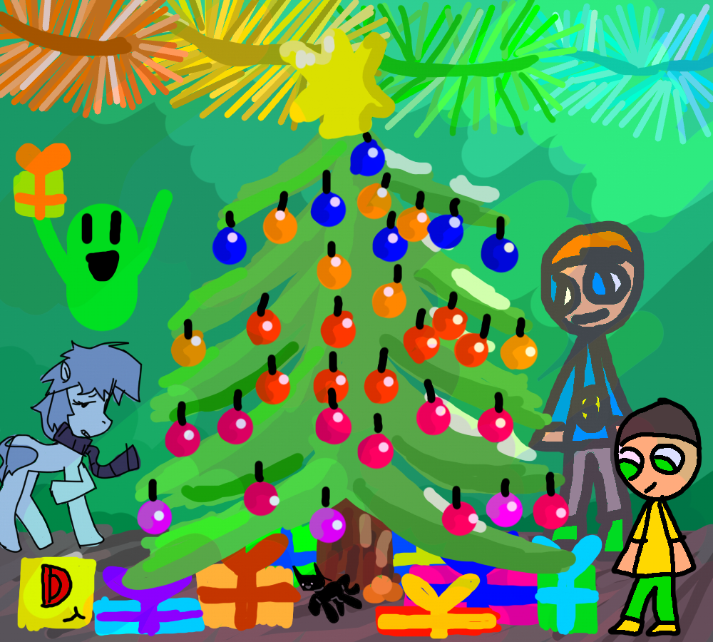 Короче я нарисовал: елку с елочными игрушками, мишуру, подарки, Лигия, его брата, фон, пол, а еще sasy и Danyak для прикола (Вот их акки: https://loneti.ru/danyak1, https://loneti.ru/sasy)