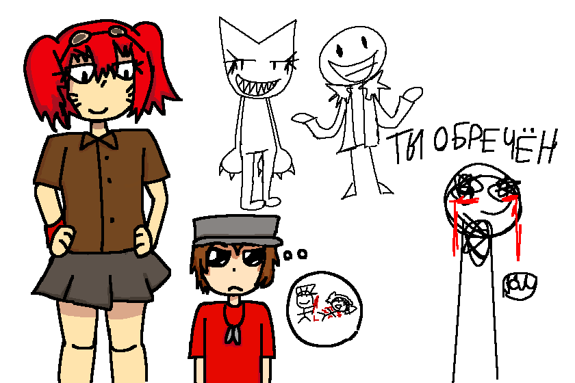 крч не обращайте на другое а обращайте авнимание на расрашенных человечков. крч ето мои персонажи из смарт мира пацана зовут скаут(типо копирка скаута из тф2) и девка рыжая по имени хилтра ну типо они друг друга не любят всьо