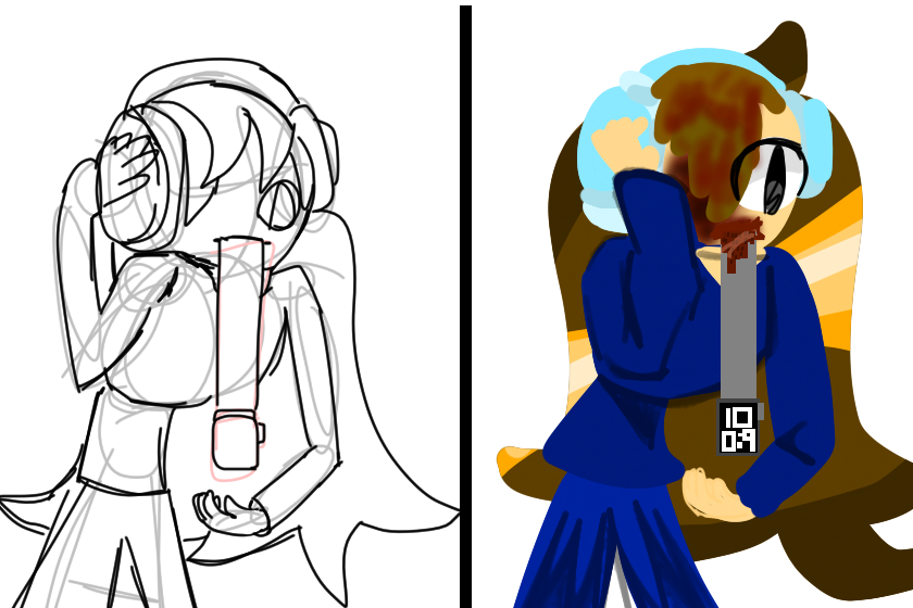 Странный скетч и внешний вид клона АБВ (Автор будущего времени), вернее её звали «Друг200», до «Друг800», тот самый клон, у которого пришит рот и потерян правый глаз, особенно держит наушники, так как она глухая