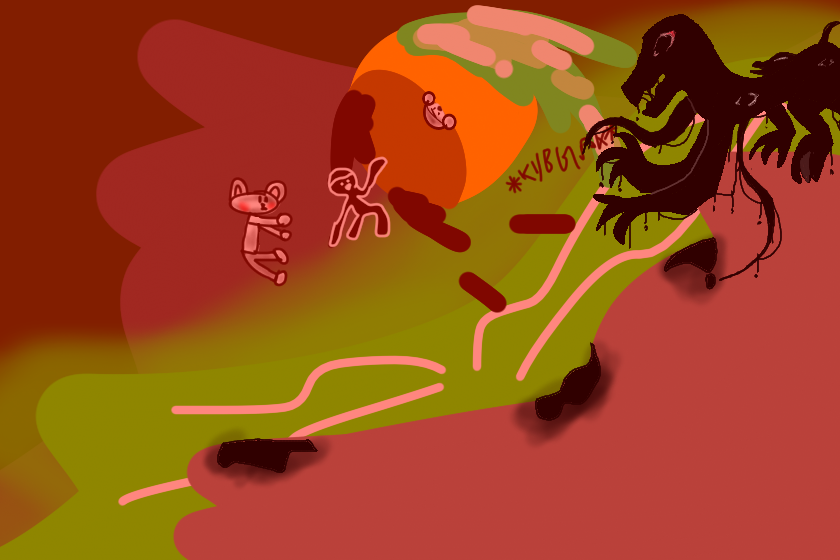 (Когда сущность 303 разозлилось, оно кинуло лодку с кувырком так, что Лирри упал в кислоту, а в лодке остались ЗЛ и Эльм)
