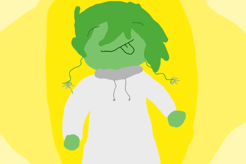 На изображении представлен мультяшный персонаж с зелёной кожей и волосами. У него закрытые глаза, что может указывать на то, что он спит или отдыхает. Персонаж одет в белую одежду с капюшоном и завязками. На фоне изображения преобладает жёлтый цвет, создавая яркий и тёплый фон. Руки персонажа опущены вдоль тела. Общий стиль изображения простой и мультяшный, с мягкими линиями и пастельными цветами.