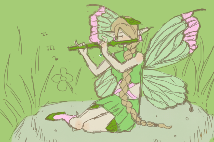 В центре композиции — очаровательная лесная фея, словно сошедшая со страниц сказочной книги. Её поза невероятно естественна и умиротворённа: она сидит на камне, погружённая в музыку, которую извлекает из зелёной флейты. Этот момент словно застыл во времени — мы видим не просто фею, а хранительницу лесных тайн, которая делится с миром своей мелодией.